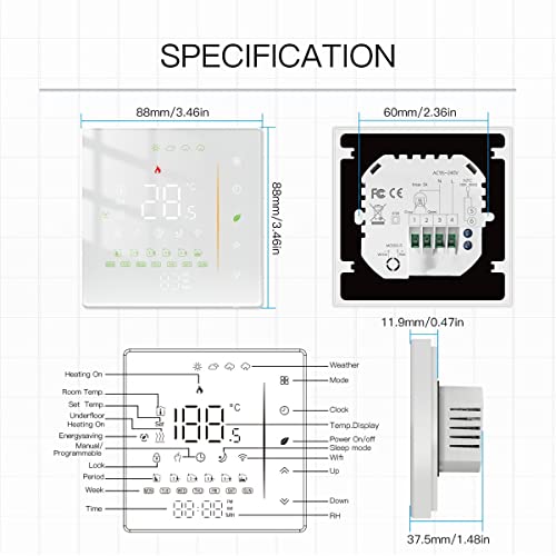 【Attenzione】 1. Solo 2,4 GHz Wi-Fi (il Wi-Fi a 5,0 GHz non è supportato) ma non ci sono limitazioni per le reti degli smartphone2. Cavo di rete necessario 3. Termostato a parete per riscaldamento a pavimento elettrico 16A