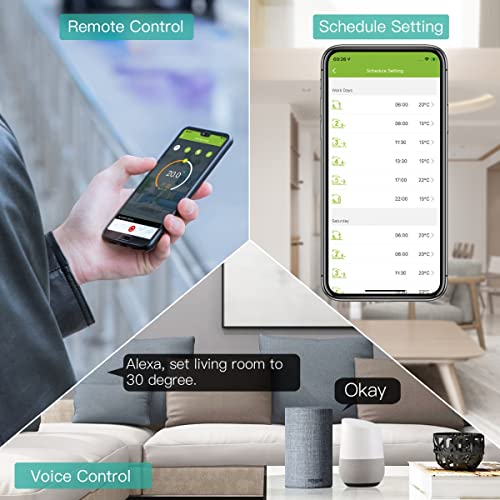 【Telecomando APP】 Controlla la temperatura della casa tramite l'APP Tuya/Smart Life (richiede una connessione WiFi a 2,4 GHz), modifica le impostazioni della temperatura sul tuo smartphone sempre e ovunque, programma, accendi il termostato ambiente e da, crea scene intelligenti o condividi dispositivi con la famiglia, implementa i controlli multiplayer