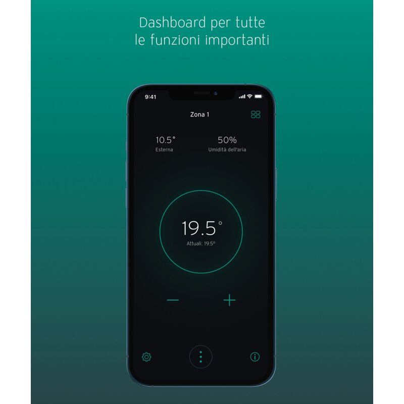 Termostato Modulante Wi-Fi Vaillant mod. VSmart Fino a 30 profili personalizzabili Monitoraggio dell‘efficienza energetica Regolare la temperatura basandoti su dati climatici rilevati da internet Funzioni rapide “Fuori Casa”, “Antigelo” e “Carico rapido bollitore" Funzione autoapprendimento e auto-programmazione Prodotti compatibili: ecoTEC PLUS, ecoTEC PLUS VM, ecoTEC PRO VMW, ecoTEC PLUS con bollitore, ecoCOMPACT VSC, auroCOMPACT VSC S, auroCOMPACT VSC D Nota: vSMART è comunque compatibile con tutti gli apparecchi Vaillant dotati di interfaccia eBUS e per le caldaie prodotte dopo il 2009. vSmart Controllare il riscaldamento e acqua calda via App Monitoraggio dell‘efficienza energetica App gratuita per i sistemi iOS e Android già disponibile per il download Dal design elegante ed essenziale si integra in qualsiaisi ambiente Funzioni rapide “Fuori Casa”, “Antigelo” e “Carico rapido bollitore" Vaillant vSMART è il sistema di termoregolazione Wi-Fi evoluto che ti permette di configurare