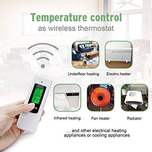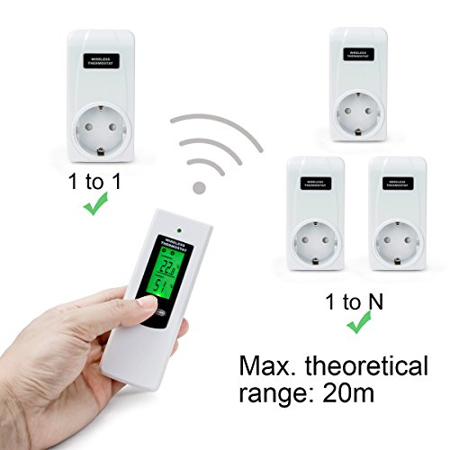 Facile da usare: Termostato digitale plug & play, l'impostazione con la funzione di memoria. La presa e il telecomando possono controllare automaticamente il codice. Dopo aver verificato il codice, il telecomando e la presa possono essere 1 a molti oppure 1 a 1. Il telecomando ha bisogno 2 batterie AAA da 1,5V.