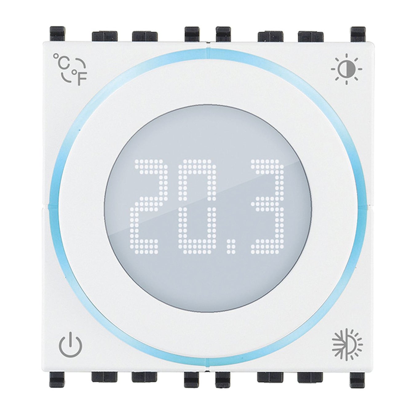 Termostato a rotella con uscita a relè 5(2) A 240 V~, tecnologia IoT su standard Bluetooth 5.0 per realizzazione sistema mesh View Wireless, 1 ingresso per sensore di temperatura esterna, alimentazione 100-240 V~ 50/60 Hz, riscaldamento e condizionamento in modalità ON/OFF e PID, dispositivo di controllo della temperatura di classe I (contributo 1%) in modalità ON/OFF, di classe IV (contributo 2%) in modalità PID, retroilluminazione a LED bianca con regolazione di intensità, alimentazione 100-240 V 50/60 Hz, da completare con placche Eikon, Arké o Plana - 2 moduli. Da completare con placche Eikon, Arké, Plana. Per Idea installabile con supporto dedicato 16723. alimentazione 100-240 V 50/60 Hz, grigio - 2 moduli.. Progettato per unire facilità del comando a rotella alla nitidezza del display a matrice di LED, il termostato smart si distingue per un design innovativo, ispirato al mondo automotive, pensato per essere usato da tutti. Proposto in due colorazio