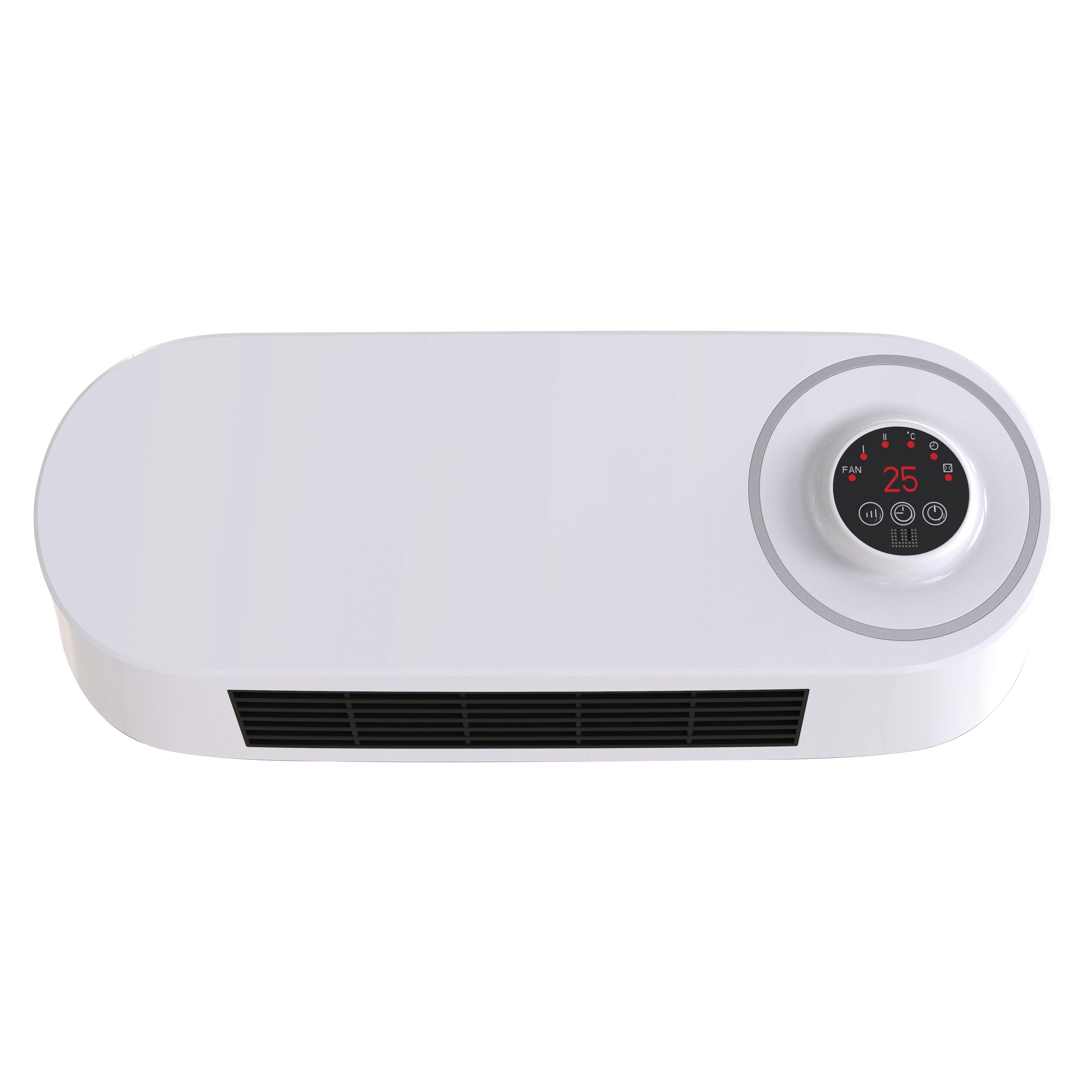 Termoventilatore murale Equation con telecomando incluso. Potenza massima 2000W. Con timer, telecomando e display LCD. Ideale per riscaldare un bagno, un soggiorno, una camera da letto o un ufficio fino a 20 m². Montaggio a parete, appositamente progettato per risparmiare spazio. Adatto per tre gradi di utilizzo grazie alle 3 impostazioni di potenza: 1000 W per ambienti fino a 10 m², 2000 W per ambienti fino a 20 m² o solo ventilazione. Con la programmazione settimanale si può avere la giusta temperatura in bagno al mattino per il primo utilizzo.. Il timer permette di spegnere l'apparecchio agli orari desiderati. Imposta con precisione la temperatura grazie al termostato elettronico. E' possibile impostare il timer fino a 8 ore prima dello spegnimento automatico.