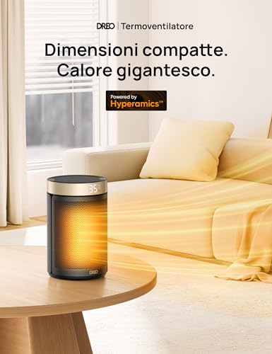 Calore potente adatto a ogni luogo: I termoventilatori Dreo Space per interni riuniscono un PTC avanzato con Hyperamics da 1500W con un canale nuovo per erogare calore in pochi secondi e migliora la circolazione dell'aria calda di oltre il 200% in più rispetto ai termoventilatori tradizionali.