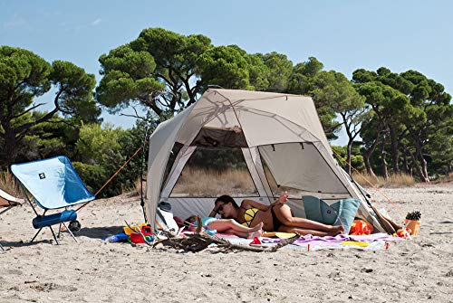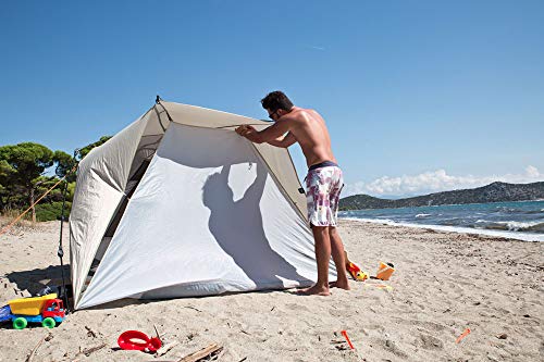 Grande tenda da spiaggia per 4 persone con alto fattore di protezione UV e dispositivo di montaggio e smontaggio automatico. Telo di copertura utilizzabile come protezione da sguardi indiscret