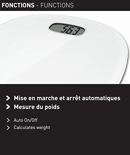 Contenuto: 1 Bilancia Pesapersone Terraillon Pop First, bianco, materiale: plastica/vetro, peso: 1,8 kg, dimensioni (L x L x A): 34,7 x 32,8 x 2 cm, funziona con 1 batteria CR2032 (inclusa)