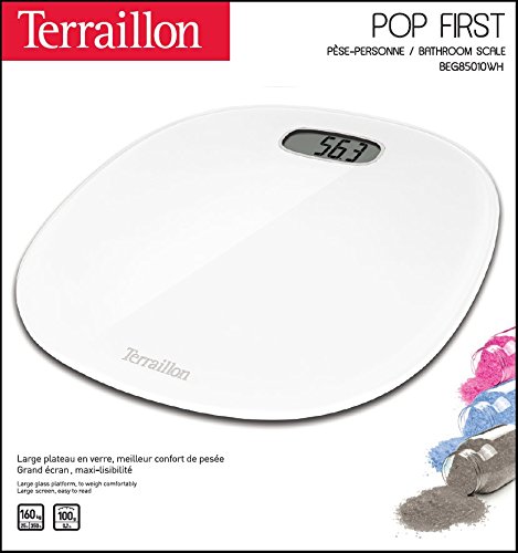 Terraillon - Bilancia pesapersone elettronica, ultra-piatta, on/off, grande schermo LCD, 160 kg, Pop First, colore: Bianco