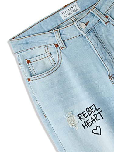 TERRANOVA - Jeans da Donna Modello Mom. Dettagli Strappi e Scritte Frontali. Modello con 5 Tasche e Chiusura con Bottone e Zip. Orlo Sfrangiato.