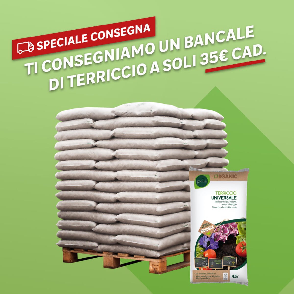 TERRICCIO UNIVERSALE GEOLIA A BANCALE (60 SACCHI DA 45LT CAD PER TOTALI 2700LT). Terriccio Universale pronto all'uso. Adatto a tutte le piante verdi e fiorite da interno ed esterno. Composizione equilibrata capace di adattarsi a tutti i tipi di piante (no acidofile).. Per una radicazione ottimale dell'apparato radicale. Ricco di elementi nutritivi che facilitano la crescita vigorosa di tutte le specie