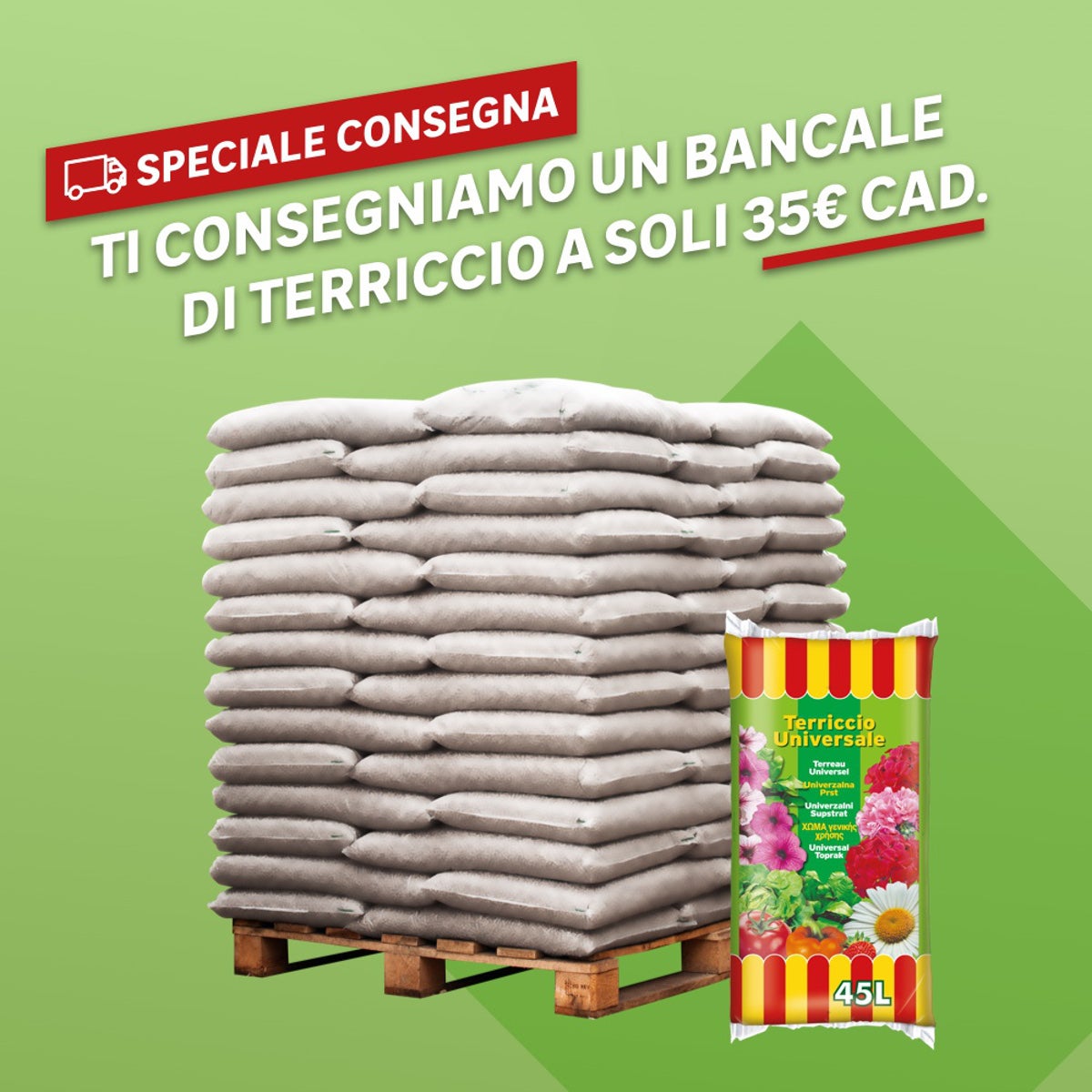 TERRICCIO UNIVERSALE A BANCALE (60 SACCHI DA 45LT CAD. PER TOTALE 2700LT). Terriccio Universale pronto all'uso. Adatto a tutte le piante verdi e fiorite da interno ed esterno. Composizione equilibrata capace di adattarsi a tutti i tipi di piante (no acidofile).. Per una radicazione ottimale dell'apparato radicale. Ricco di elementi nutritivi che facilitano la crescita vigorosa di tutte le specie