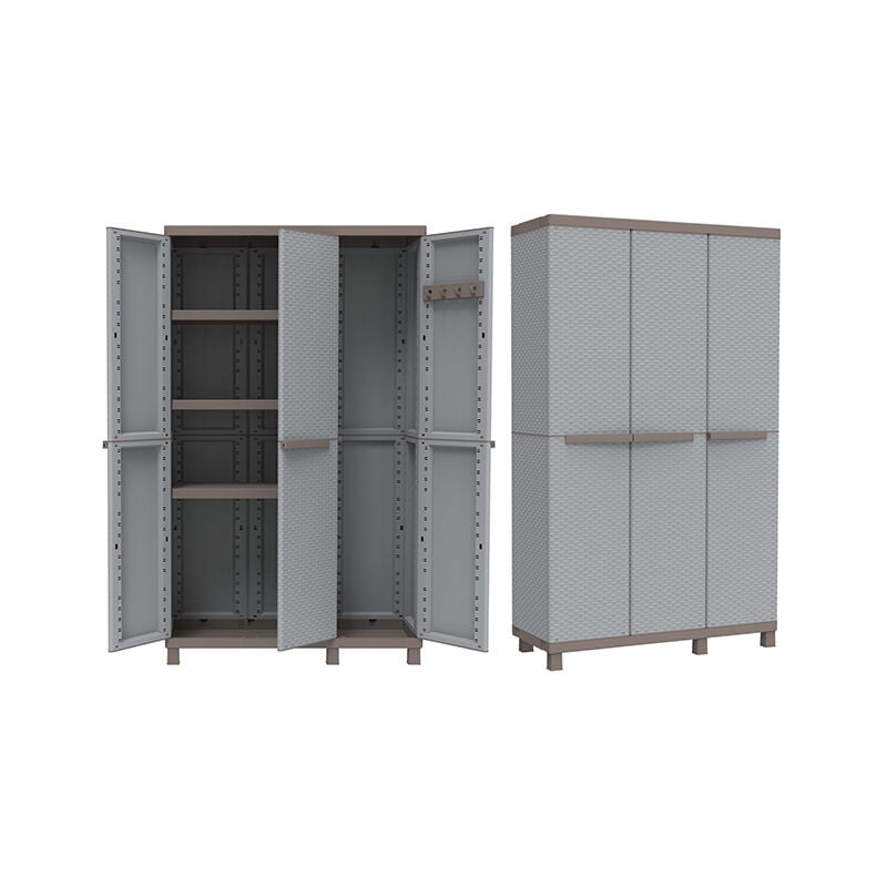 Serie C-RATTAN Art. TP102 A in polipropilene, finitura effetto rattan. Ottima resistenza agli agenti atmosferici. Tripla anta, tre ripiani interni e vano portascope. Ripiani regolabili in altezza. Portata ripiano 20 kg uniformente distribuiti. Poss