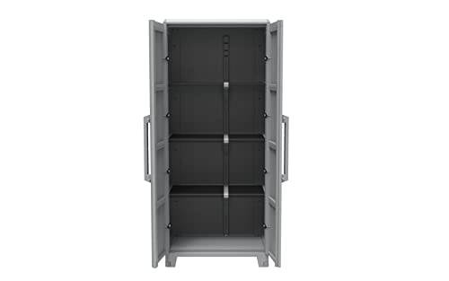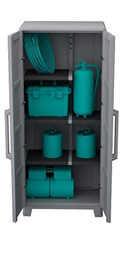 Caratteristiche: armadio alto multifunzione in plastica a due porte. Ripiano con capacità di carica massima di 40 kg uniformemente distribuiti