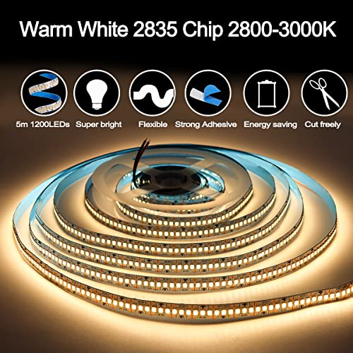 Applicazione: strisce LED super luminose 12V, bianco caldo 3000K SMD 2835 totale 5M 1200 LEDs, 240 LEDs / m, per camera da letto, sala da pranzo, cucina, retroilluminazione, giardino, illuminazione per feste, risparmio energetico e sicuro da usare.