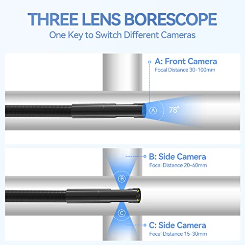 ⭐【Telecamera di Ispezione Triplo Lente】Con tre telecamere a 78° integrate nell'estremità della sonda del borescope e un angolo di visione totale di 234°, consente una visione più completa e chiara da tutte le angolazioni. È ampiamente utilizzato per la riparazione di autoveicoli, l'ispezione di macchinari industriali, la riparazione di tubi, l'ispezione di apparecchiature HVAC domestiche, l'ispezione di strutture murarie, l'ispezione di fognature e altre aree inaccessibili.