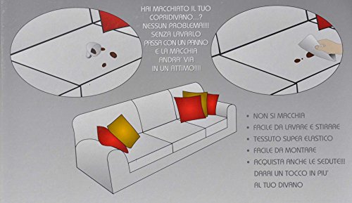 elastici per lato da far passare sotto la seduta per renderlo ancora piu' stabile e fermo.Disponibile in molti colori e tante misure che puoi trovare nelle rispettive categorie. Copripoltrona da 75 cm. a 110 cm. max.Copridivano 3 posti da 160 cm a 230 cm. max.Coprisedute singole, per 2 posti o 3 posti. Composizione 95% Poliestere 5% ElastomeroLavabile in lavatrice.Made in Italy. Specifiche del Trattamento antimacchia. Il tessuto e' trattato in Italia con un trattamento derivato dalle