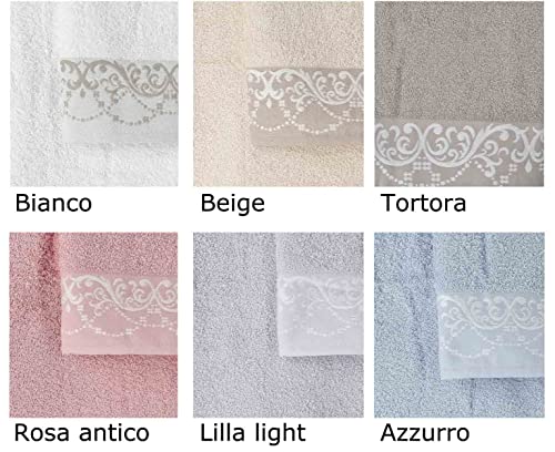 La coppia comprende un asciugamano viso 60x100 cm e un ospite 40x60 cm circa mentre il telo bagno misura di 100x150 cm.