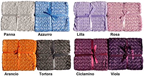 Un plaid molto caldo grazie al doppio strato, creato infatti da un tessuto in pile raso e in tinta unita come retro accoppiato a un diritto dal pelo lungo dal grazioso movimento a girandoline che creano un disegno che ricorda boccioli di rosa.