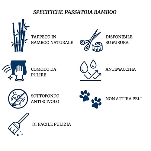 Una passatoia creata infatti con listarelle di bamboo naturale di 15 mm. circa di larghezza per una altezza di 50 cm. accoppiate ad un fondo gommato che permette di tenerle unite e allo stesso tempo dare fermezza alla corsia.