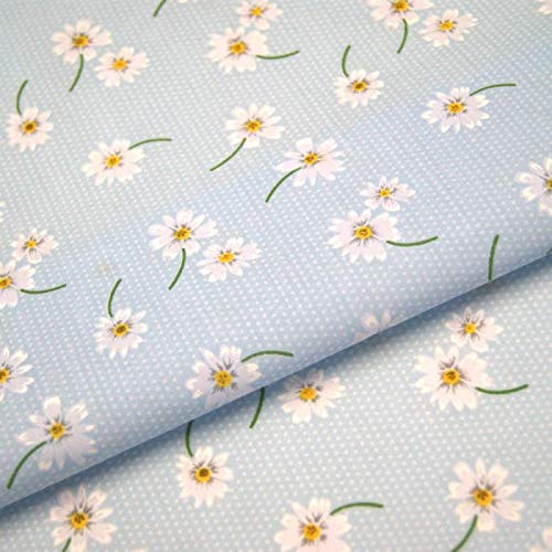 Tessuto floreale con margherita e pois, pallini, puntini, blu cielo, Policotone, Sky, Blue, Metre