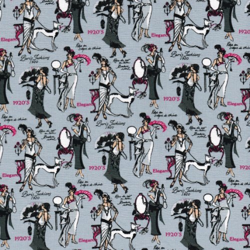 La dimensione della parola ‘Elegance' è circa 0,30cm x 2,20cm, la dimensione della signora con il cane è circa 7,50cm x 5cm e la dimensione della signora con il ventaglio rosa è circa 7,50cm x 4cm. Il design del tessuto ripete ogni 16 cm x 8,50 cm.