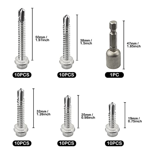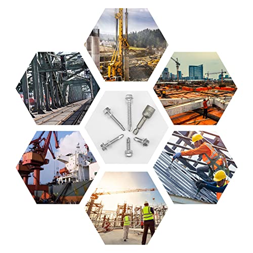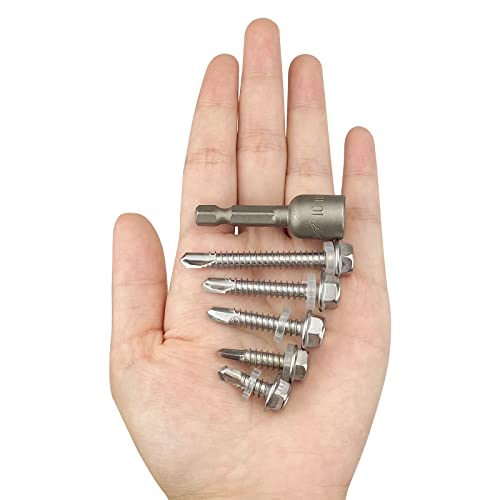 51 viti a testa esagonale M6.3 in acciaio inox autofilettanti con filettatura completa per coperture in metallo, viti a coda di rondine esagonali esterne, autoperforanti, con dado setter, rondelle