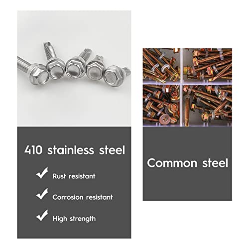 Materiale di qualità: queste viti autoperforanti sono realizzate in acciaio inossidabile 410 ad alta resistenza, durevoli, anticorrosione e antiruggine. Il design a filettatura profonda impedisce alla vite di scivolare.