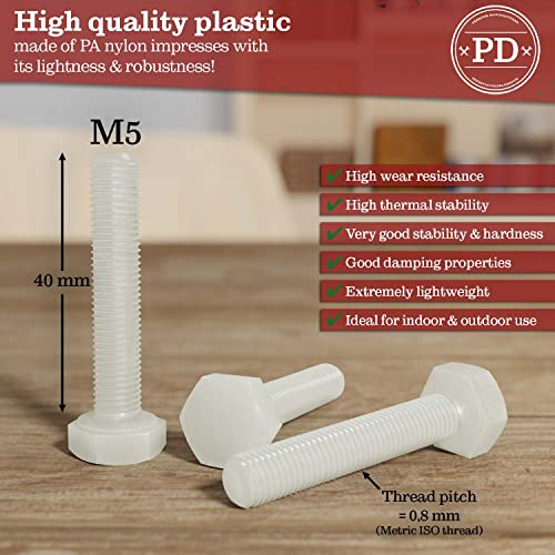 PD® Viti a testa esagonale in plastica M5 x 40 mm (DIN 933 / ISO 4017) | Viti in nylon PA | Viti a testa esagonale con filettatura metrica ISO completa | Viti da macchina a testa esagonale | 4 pz.