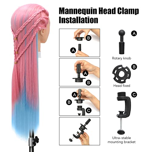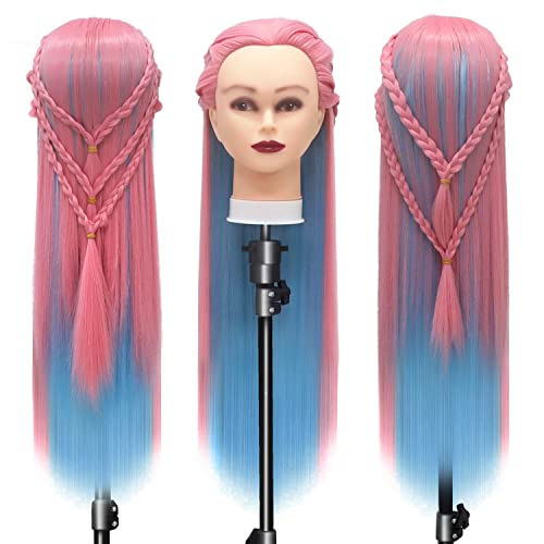 Testa da parrucchiere, 28 pollici Teste per acconciature sintetiche al 100% Teste per parrucchieri Teste per parrucchieri con staffa + Accessori per capelli fai-da-te Rosa ciano