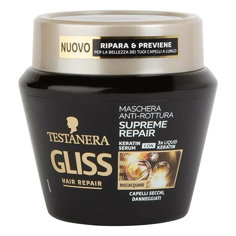 I tuoi capelli molto danneggiati perdono la Cheratina con un conseguente indebolimento della struttura capillare. E' necessaria una riparazione estrema che colmi la carenze di Cheratina. Supreme Repair di Gliss è la linea di trattamento completo per i capelli secchi e danneggiati. Le formule di Gliss contengono Keratin Serum. per riparare i danni esistenti e fortificare la struttura cellulare. prevenendo i danni futuri. La maschera è essenziale nella routine della cura dei capelli. fornendo la necessaria cura rigenerante dopo shampoo e balsamo. La Maschera Anti-Rottura Supreme Repair. arricchita con 3x Liquid Keratin. colma con precisione le carenze di Cheratina e ripara la struttura del capello. BENEFICI: Ricostruzione profonda della struttura capillare Capelli fino al 95% più resistenti e brillanti Texture cremosa e avvolgente CONSIGLI DI UTILIZZO: Massaggiare delicatamente sui capelli dopo averli lavati e tenere in posa per 2-3 minuti. Risciacquare abbondantemente! Usare 2-3 volte