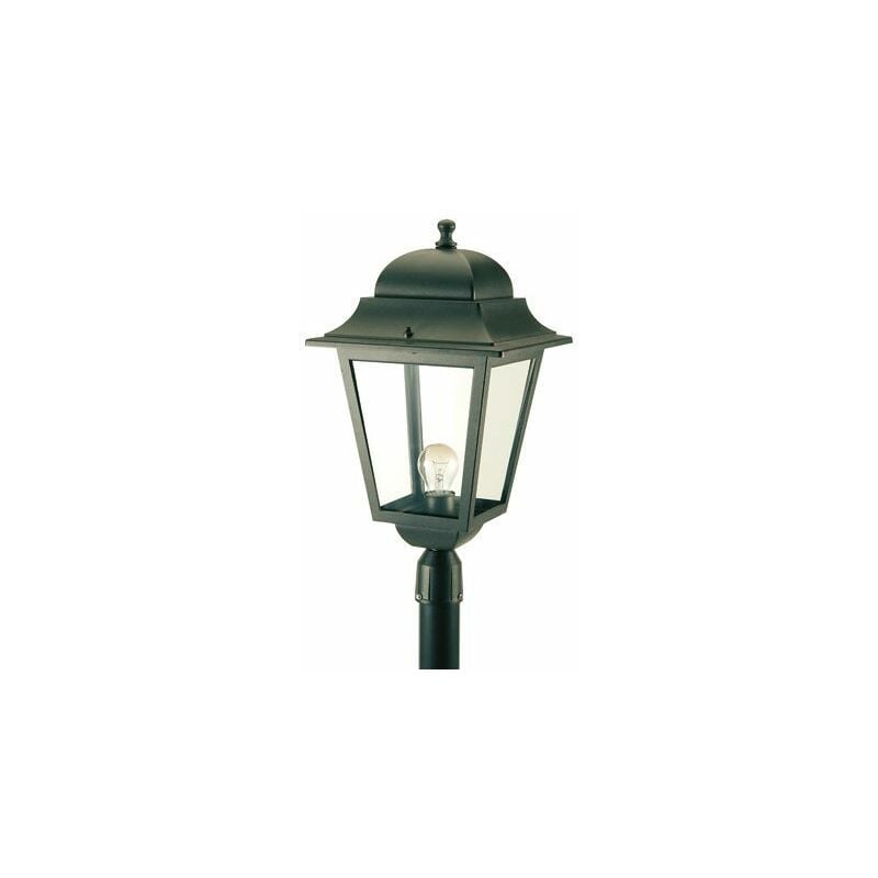 Struttura in pressofusione di alluminio. Diffusori in vetro trasparente. Testa palo con manicotto da 60mm di diametro. Dispositivo di connessione e accessori per il fissaggio. Portalampada in porcellana con attacco E27. Altezza lampada: max 240mm. Lampada esclusa. Alimentazione 230V ~ 50Hz. Classe di protezione: IP43 Potenza massima lampade: 100W
