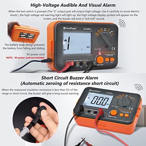 【Alimentazione e garanzia di 1 anno】Il MegOhmmeter può essere alimentato non solo da sei batterie AA da 1,5 V (incluse), ma anche collegato a un cavo di alimentazione esterno 9V DC (non incluso) per fornire energia elettrica. MegOhmmeter adatto per misurare la resistenza di isolamento