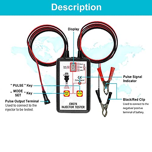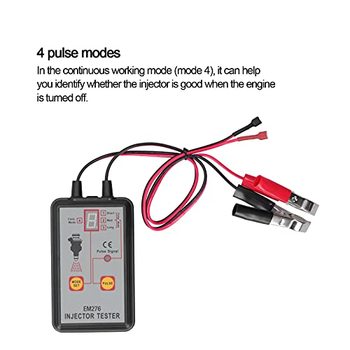 CARATTERISTICHE ECCELLENTI:-- Nella modalità di lavoro continuo (modalità 4), può aiutarti a identificare se l'iniettore è buono quando il motore è spento. 4 modalità di impulso, l'impulso di uscita e la larghezza dell'impulso sono 1 impulso/250 ms, 50 impulso/7 ms, 100 impulso/3,5 ms e 50 impulsi continui per 1450 ms con una larghezza di impulso di 7 ms per ciascuno.
