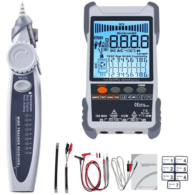 Basso. Funzione multimetro: Questa funzione include la misurazione della corrente CC e della tensione e della corrente CA, resistenza, continuità, diodi, misurazione della temperatura. < br /> Specifiche: Materiale: ABS Potenza: < br/>Host: batteria al litio integrata, 1250 mAh (inclusa) Ricevitore: 1 batteria da 9 V (NON INCLUSA) Tracciamento analogico: √ Continuità: tramite funzione multimetro Tracciamento switch (con PoE): √ Mapping Cable Disconnect: √ Interruttori lampeggianti: √ Tracciamento digitale silenzioso: digitale/vibrazione Misurazione della tensione PoE: tensione/polarità < br/> />Mappatura ID remoto: 7XID Grafico a barre analogico: √ Rilevamento NCV: √ >Misurazione della lunghezza del cavo di rete: 600 M < br /> Altre funzioni: torcia corpo principale, indicatore jack ingresso multimetro, display LCD, torcia bianca, suono traccia analogico regolabile, tra digitale, sensibilità ping regolabile, indicatore batteria scarica, retroilluminazione bianca, indicazione energia