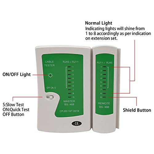 Funzionamento automatico: inserendo i cavi, questo tester per cavi funzionerà automaticamente, la luce LED visualizzerà lo stato e qualsiasi risoluzione dei problemi come cortocircuito, circuito aperto e linea trasversale può essere trovato rapidamente e facilmente.