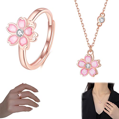 TETHY Sakura Flower Spinner Ring, S925 Regolabile Spinner Ring, Alleviare Ansia Stress Noia Calmante Preoccupazione Meditazione Anelli Collana Gioielli (Necklace+Ring)