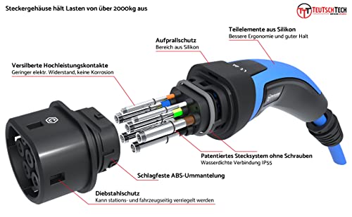 TEUTSCHTECH, Cavo di ricarica EV a spirale I 5M I TYP2 fino TYP2 I 22kW I 3X32A I Trifase I Lunghezza utile circa 3M I Contatti argentati I Sensore di temperatura I Protezione antincendio