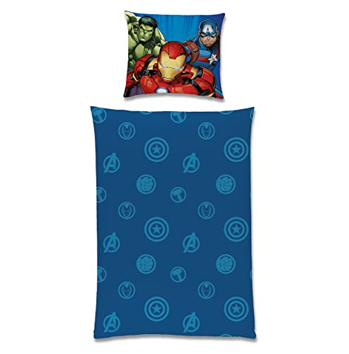 TexIdea - Set copripiumino letto double-face, motivo di Avengers: Endgame, con copripiumino 135 x 200 cm e federa per cuscino 80 x 80 cm, 100% cotone, con chiusura lampo, colore: blu