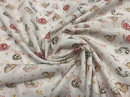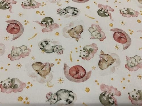 Tessuto in popeline di cotone biologico al 100%, con una superstampa di tutti i tipi di animali che dormono come orsi, volpi, ecc.
