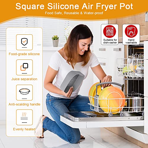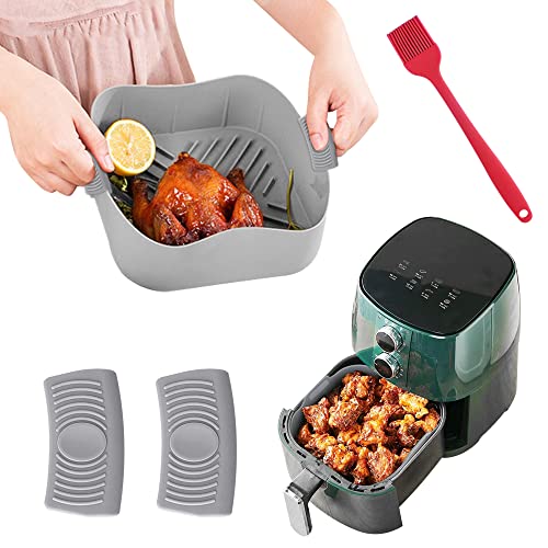 THATSRAD Cestino per Friggitrice ad Aria in Silicone 20,5cm Teglia Quadrata per Friggitrice ad Aria Pentola in Silicone Riutilizzabile con Guanti e Spazzola per Friggitrici ad Aria Forni Microonde