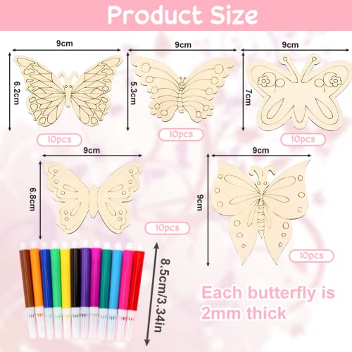 THATSRAD 50 Pezzi Artigianato a Farfalla in Legno Farfalla Vuoto in Legno Non Finito Legno Incompiuto a Forma di Farfalla con Matite Acquerellabili per Bambini Pittura Artigianato Fai-da-Te, 5 Stili