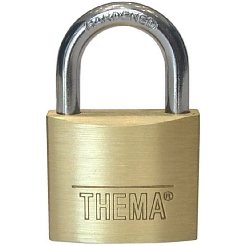 THEMA - LUCCHETTO OTTONE ARCO NORMALE MM. 60 Lucchetto Thema pesante arco normale in ottone massiccio con tre chiavi. Gancio in acciaio cementato e temprato. A 60 mm - D 8 mm - L 37 mm - C 32 mm - S 18 mm.