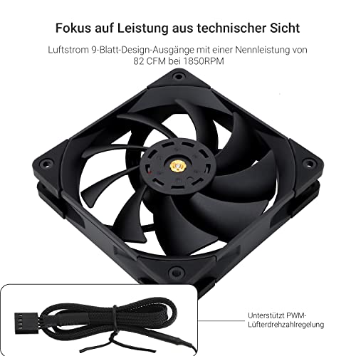 Dimensioni della ventola dell'alloggiamento: dimensioni: 120 x 120 x 25 mm, velocità: 1850 RPM ± 10%, rumore ≤ 29,6 dBA. Connettore: 4 pin pwm, corrente: 0,25 A, pressione dell'aria: 2,1 mm H2O (MAX), flusso d'aria 82 CFM, maggiore flusso d'aria per una migliore prestazione di raffreddamento.