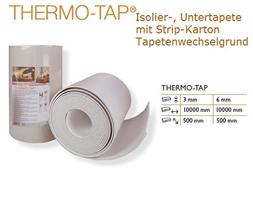 Carta da parati isolante Thermo-Tap 3 da 10 mq (2 rotoli). Lunghezza per rotolo: 10 m, dimensioni: 500 x 3 mm, materiale: polistiene espanso, superficie: strato di carta, densità circa 45 kg/m³.