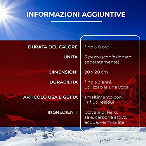 IMMEDIATAMENTE UTILIZZABILE: Non c'è bisogno di bollirli o riscaldarli prima dell'uso. Forniscono fino a 8 ore di calore naturale di ca. 48°C. Durata di conservazione: parecchi anni in confezione chiusa.