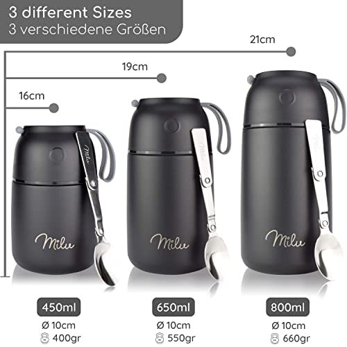 Milu Thermos per Alimenti con incisione I 450ml / 650ml / 800ml I Contenitore Termico di Acciaio Inossidabile, Isotermico Sottovuoto per Cibi Caldi e Freddi (Nero, 450ml)