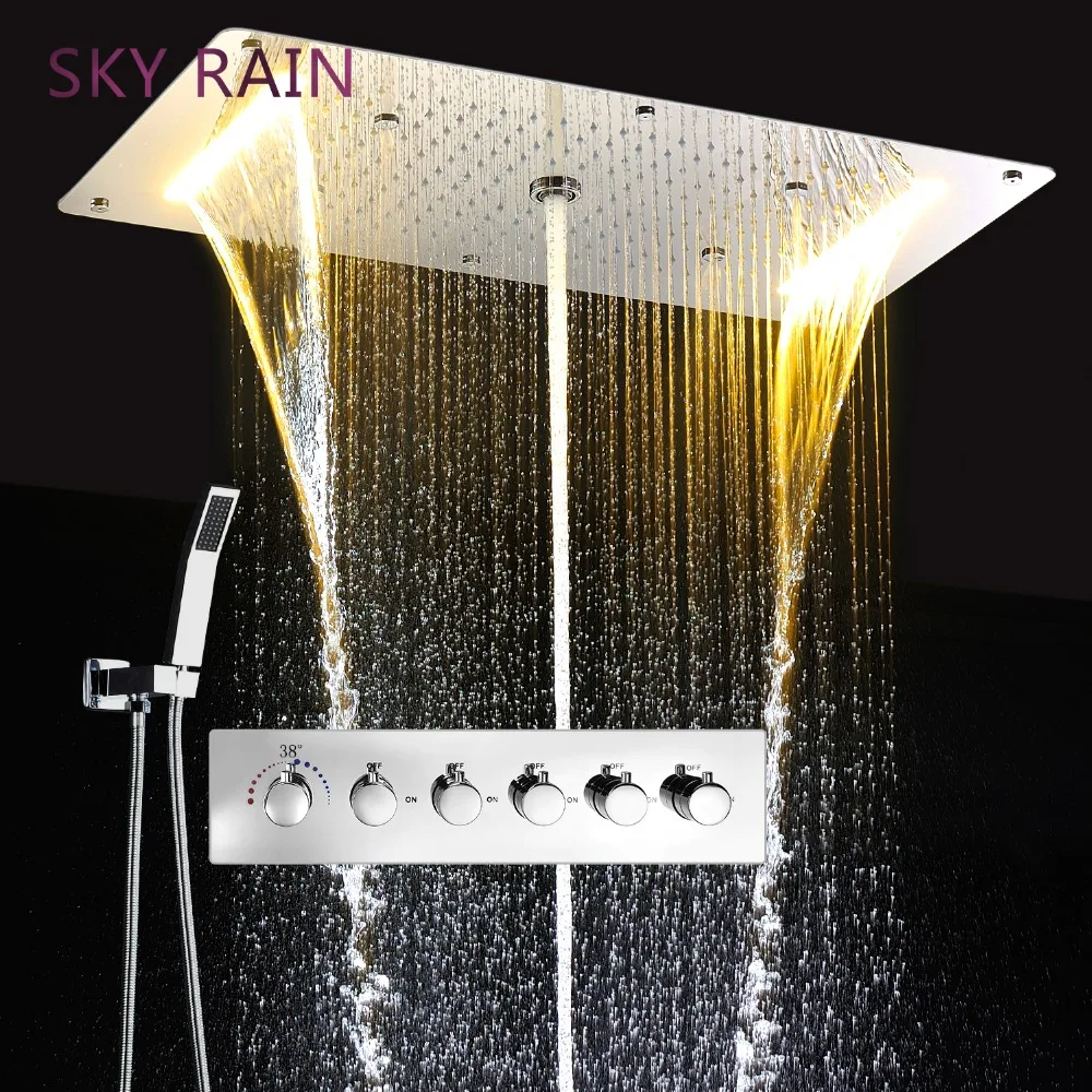 SKY RAIN Thermostatic Valve Square LED Shower Head Rainfall Waterfall Mist Spray Water Column Shower Set