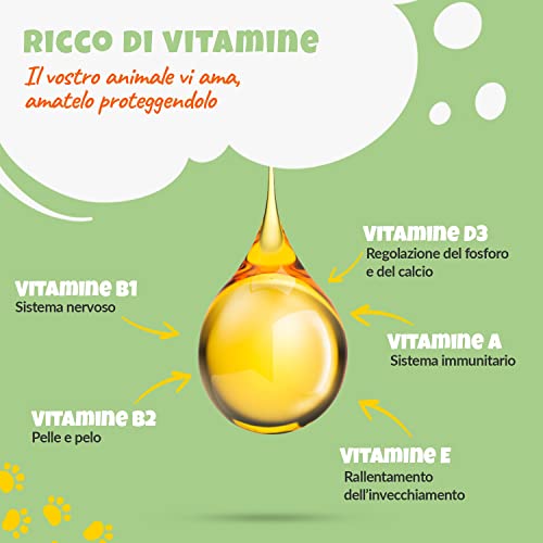 [Integratore alimentare] Contiene vitamine A, B1, B2, D3, E, antiossidanti e minerali combinati con acidi grassi essenziali che non vengono prodotti dall'organismo e svolgono un ruolo cruciale per le funzioni vitali del cervello. Basta metterne qualche goccia sul bocconcino o nel cibo: è semplicissimo.