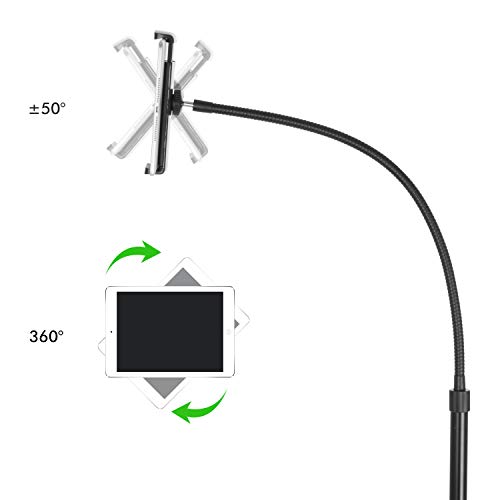 Regolazione flessibile dell'angolo: il braccio flessibile a collo d'oca può essere facilmente regolato nella posizione desiderata. La sfera universale sul retro del morsetto per tablet fornisce una rotazione di oltre 360 gradi. È disponibile per regolare l'angolo di visione di iPad o telefono con una mano. (Questo supporto da pavimento per tablet è adatto solo per leggere e guardare l'uso, non per digitare!) Utile - Il braccio flessibile a collo d'oca può essere piegato in qualsiasi direzione. Il supporto rotante a 360 gradi soddisferà meglio le tue esigenze.