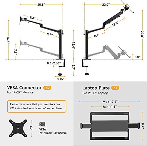 Compatibilità universale: supporto per monitor a doppio braccio/laptop da 17"-27" per PC monitor/schermo TV e laptop da 12"-17". Adattatore VESA da 75 × 75 mm/100 × 100 mm e vassoio per laptop compatibile con vari modelli come Dell, HP, BenQ, AOC, Acer, LG, ecc.