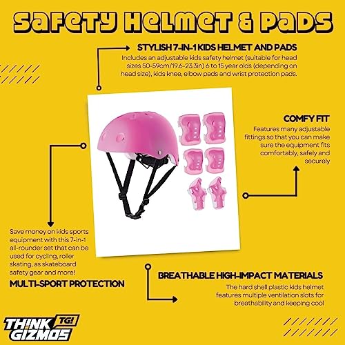 Think Gizmos Set di casco e cuscinetti regolabili per bambini dai 3 anni in su, casco da bicicletta, ginocchia, gomiti e polsi, per pattinaggio a rotelle, skateboard, scooter e ciclismo (rosa)