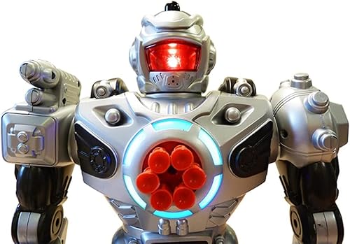 FUNZIONI MULTIPLE: cammina, parla, balla con la musica e spara missili dallo stomaco. Il contenitore girevole incorporato nel suo stomaco contiene 6 missili di schiuma. Rimettili nello stomaco per ricaricarli! Avvicinati al tuo nemico e spara!